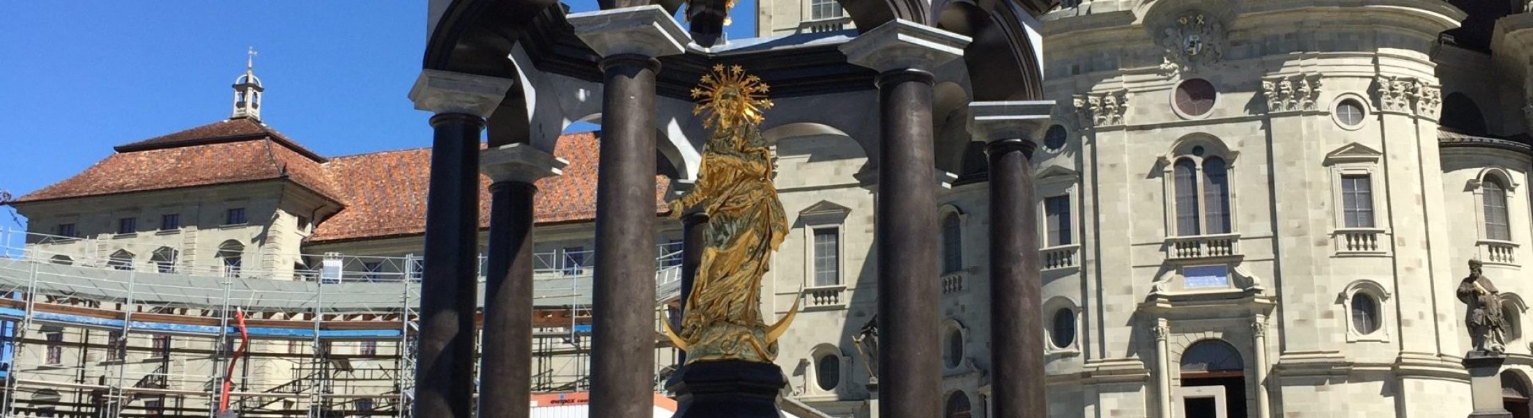 „…..Als ich nach der Rückkehr noch den grossen Platz vor der Klosterkirche betrat, verwunderte ich mich über seine absolute Menschenleere. Die Abendsonne und das Steinpflaster waren ganz allein , und der grosse Brunnen rollte sein Wasser monoton in die Stille hinein. Es könnte auf keinem Dorfkirchplatz stiller und einsamer sein.“